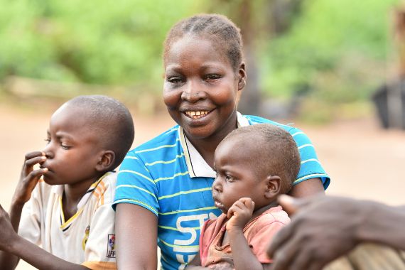 Happy Pasi is recovering after surgery, surrounded by her family and children. Pasi Weke, 30, is a farmer in Northern Congo and a mother of four. She received trachoma trichiasis surgery supported by CBM.